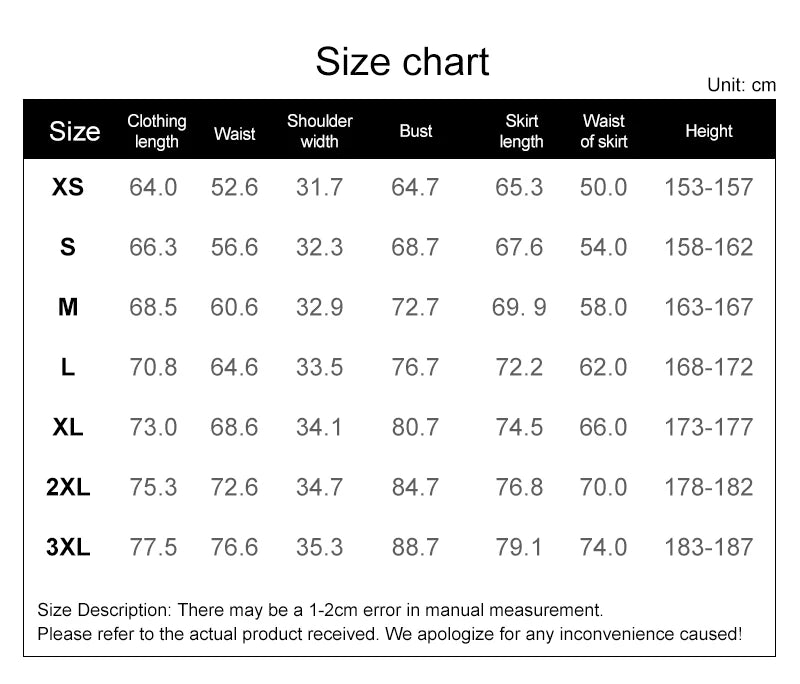 - 3XL: Largo total: 77.5 cm | Cintura: 76.6 cm | Ancho de hombros: 35.3 cm | Busto: 88.7 cm | Largo falda: 79.1 cm | Cintura falda: 74 cm